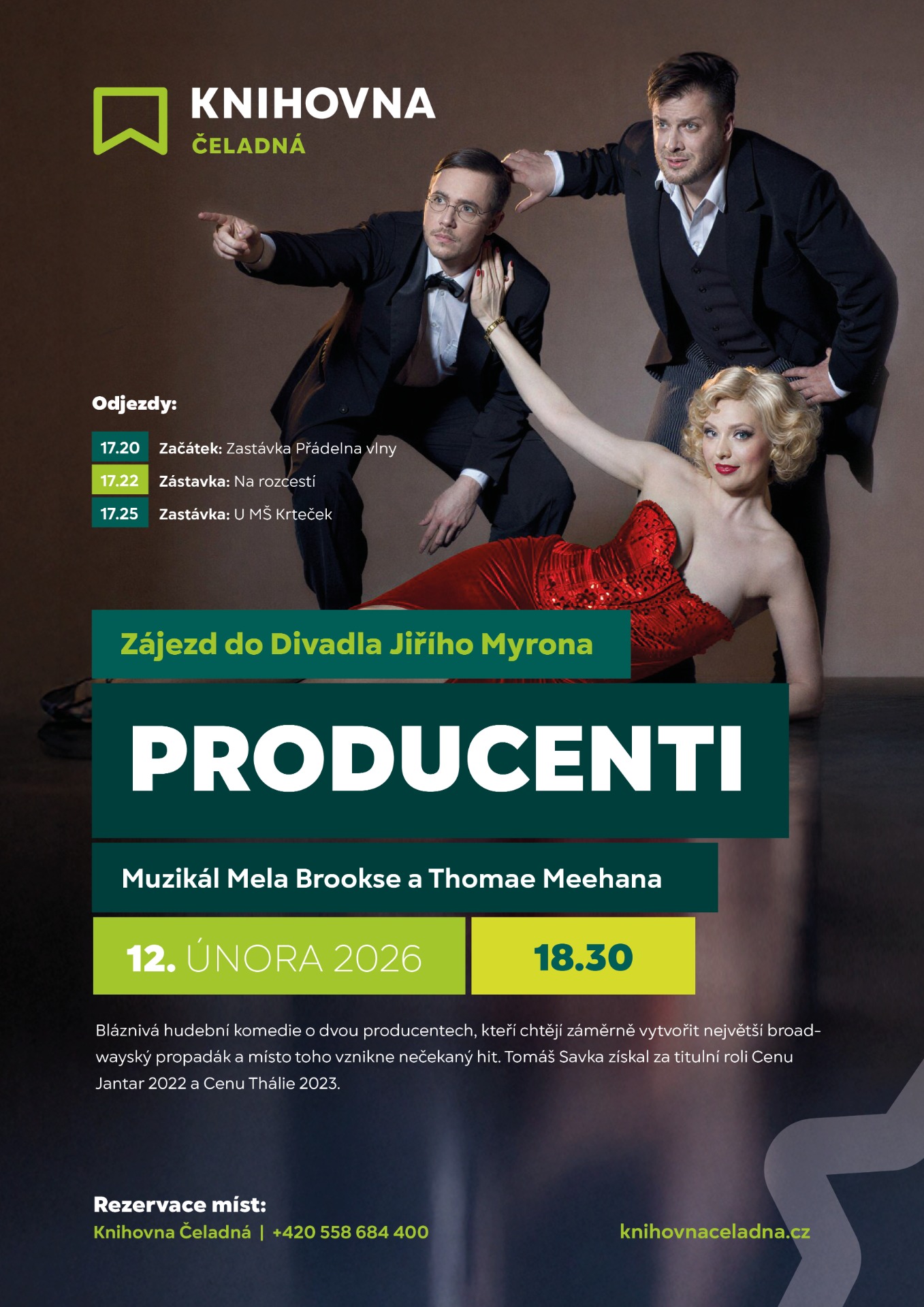 Knihovna pořádá zájezd do divadla na muzikál Producenti, který se uskuteční ve čtvrtek 12. února 2026 v 18:30 v Moravskoslezském divadle Jiřího Myrona v Ostravě. Doprava je zajištěna autobusem. Zájemci se mohou hlásit v osobně v knihovně nebo telefonicky na čísle 558 684 400.