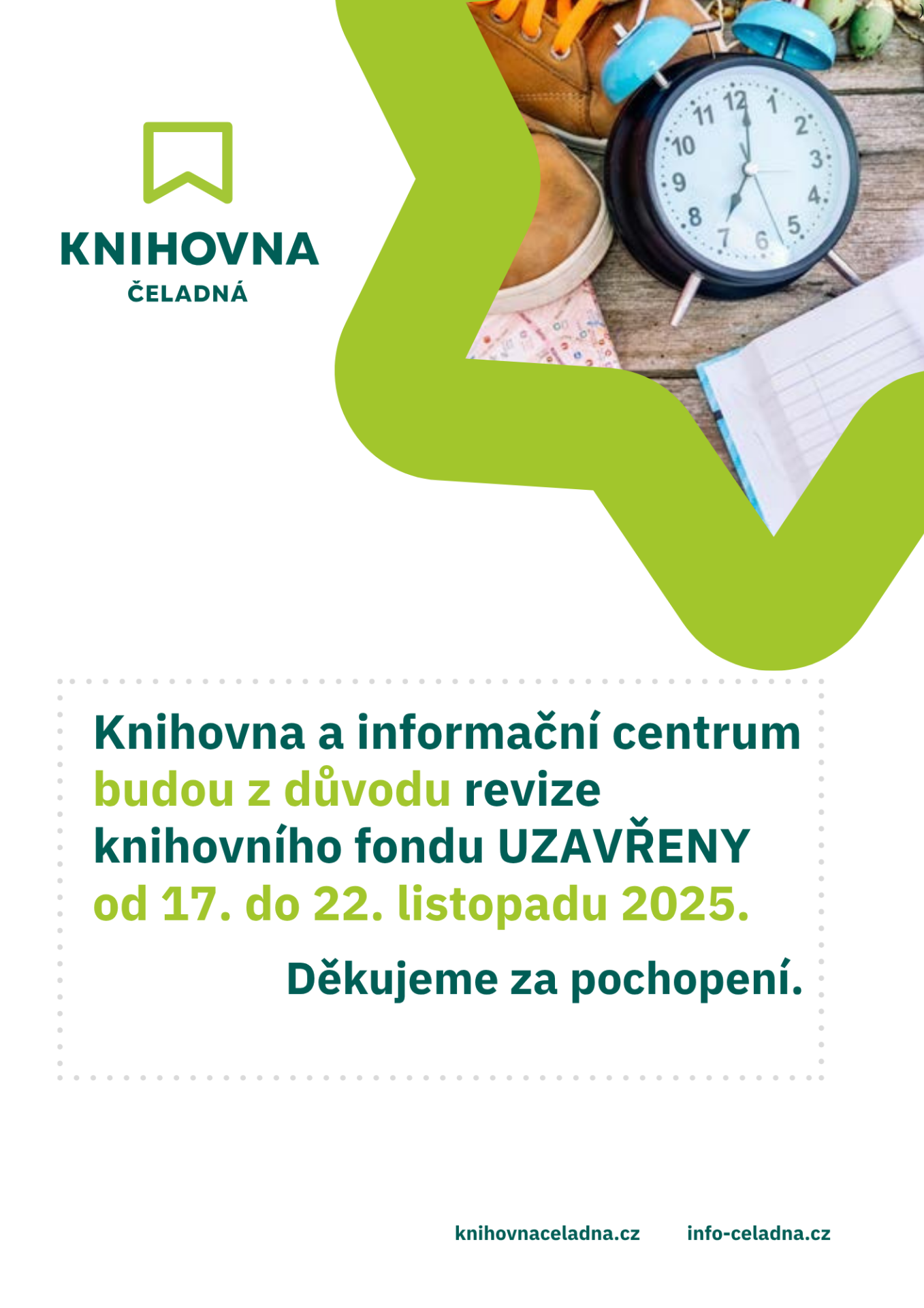 Milí čtenáři, v termínu 17.–22. listopadu 2025 bude knihovna uzavřena z důvodu revize knihovního fondu. Prosíme vás, abyste si výpůjčky naplánovali s předstihem. Děkujeme za pochopení a těšíme se na vás opět od pondělí 24. listopadu.