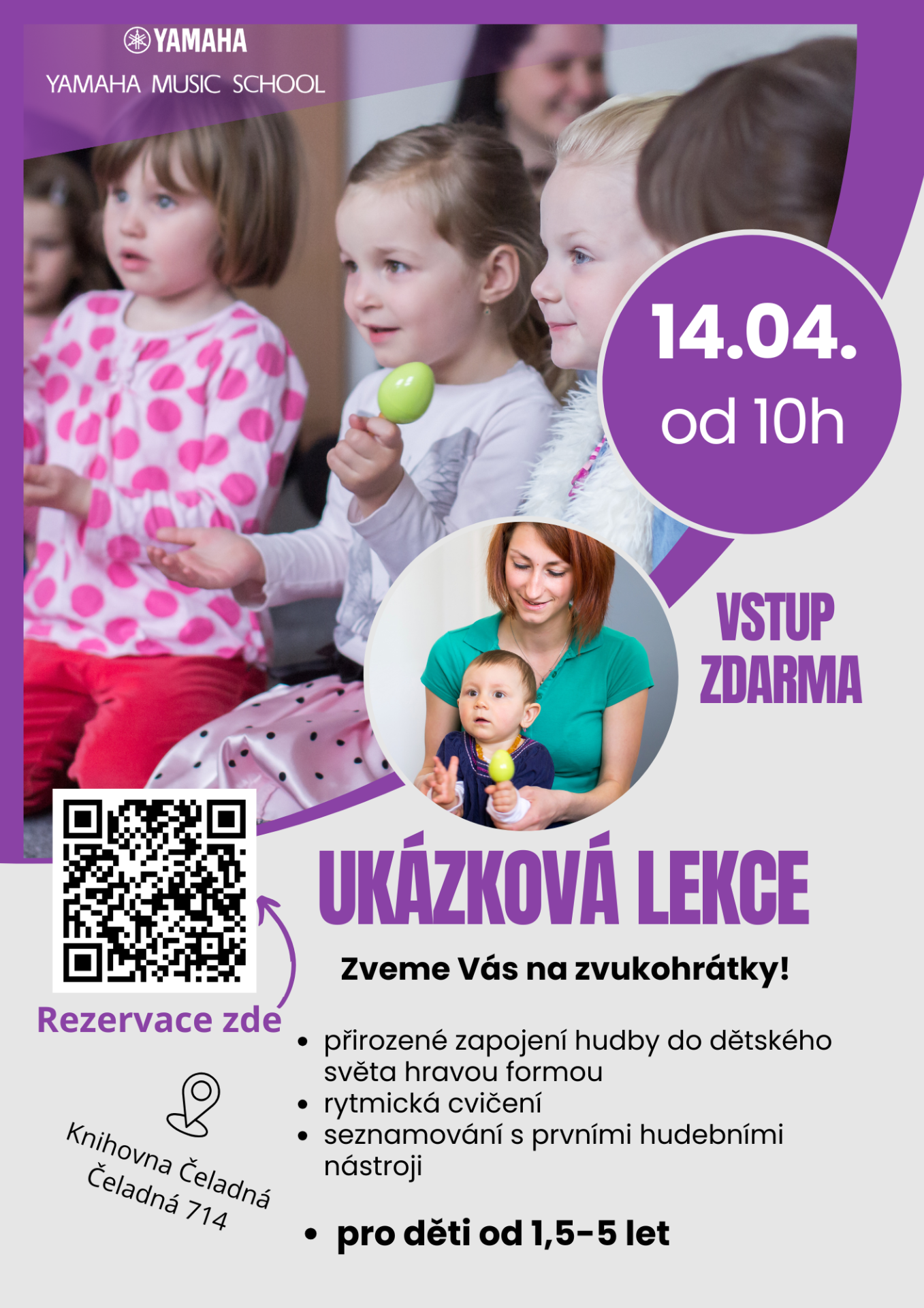 Zveme maminky s dětmi od 18 měsíců do 4 let na ukázkovou lekci Hudební školy Yamaha, kde děti hravou formou rozvíjejí sluch, řeč, pohyb a sociální dovednosti. Lekce zahrnují písničky, říkadla, rytmické hry, jednoduché hudební nástroje a společné rituály, které podporují pozornost, paměť, koordinaci i socializaci.