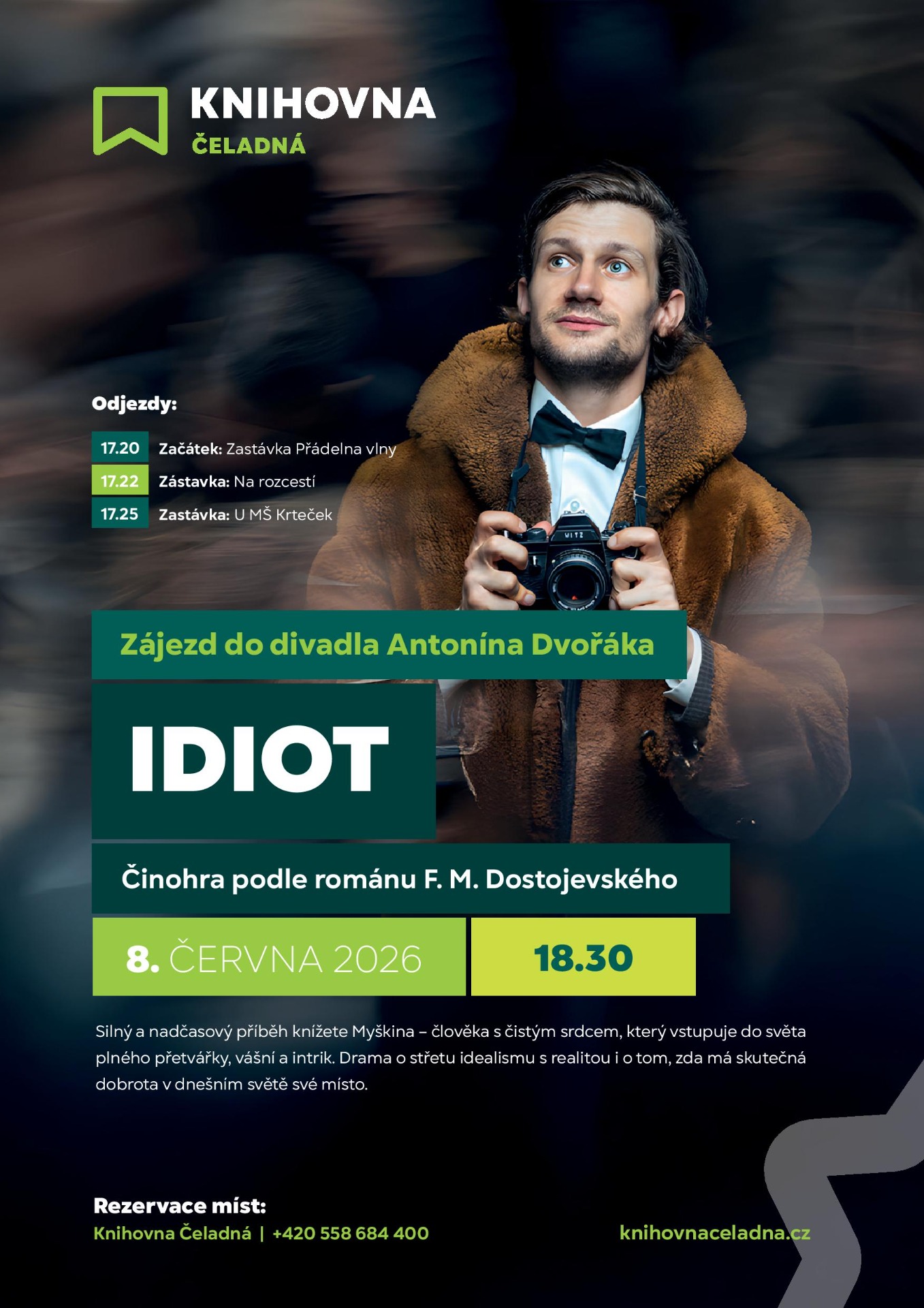 Knihovna Čeladná pořádá zájezd do Národního divadla moravskoslezského v Ostravě na činohru Idiot, uváděnou v Divadle Antonína Dvořáka, který se uskuteční 8. června 2026 v 18.30 hodin. Inscenace podle románu Fjodora Michajloviče Dostojevského přináší příběh knížete Myškina – člověka s čistým srdcem, který se po návratu do společnosti dostává do světa plného vášní, intrik a lidské přetvářky.